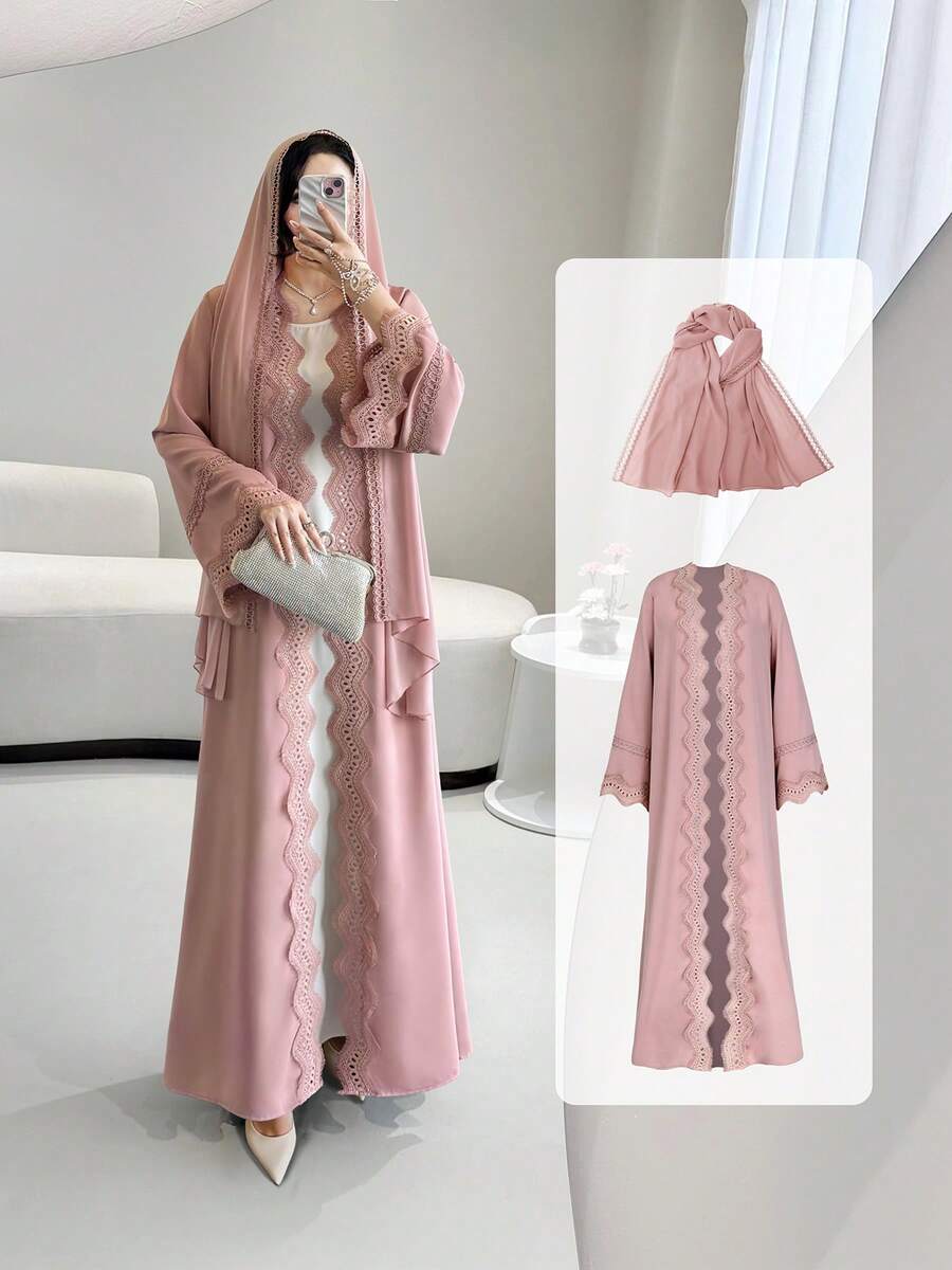 女士长袍套装,蕾丝边开襟长袍,内含无袖连衣裙和雪纺头巾 - 轻盈、端庄、透气,适合春夏穿着,优雅派对礼服