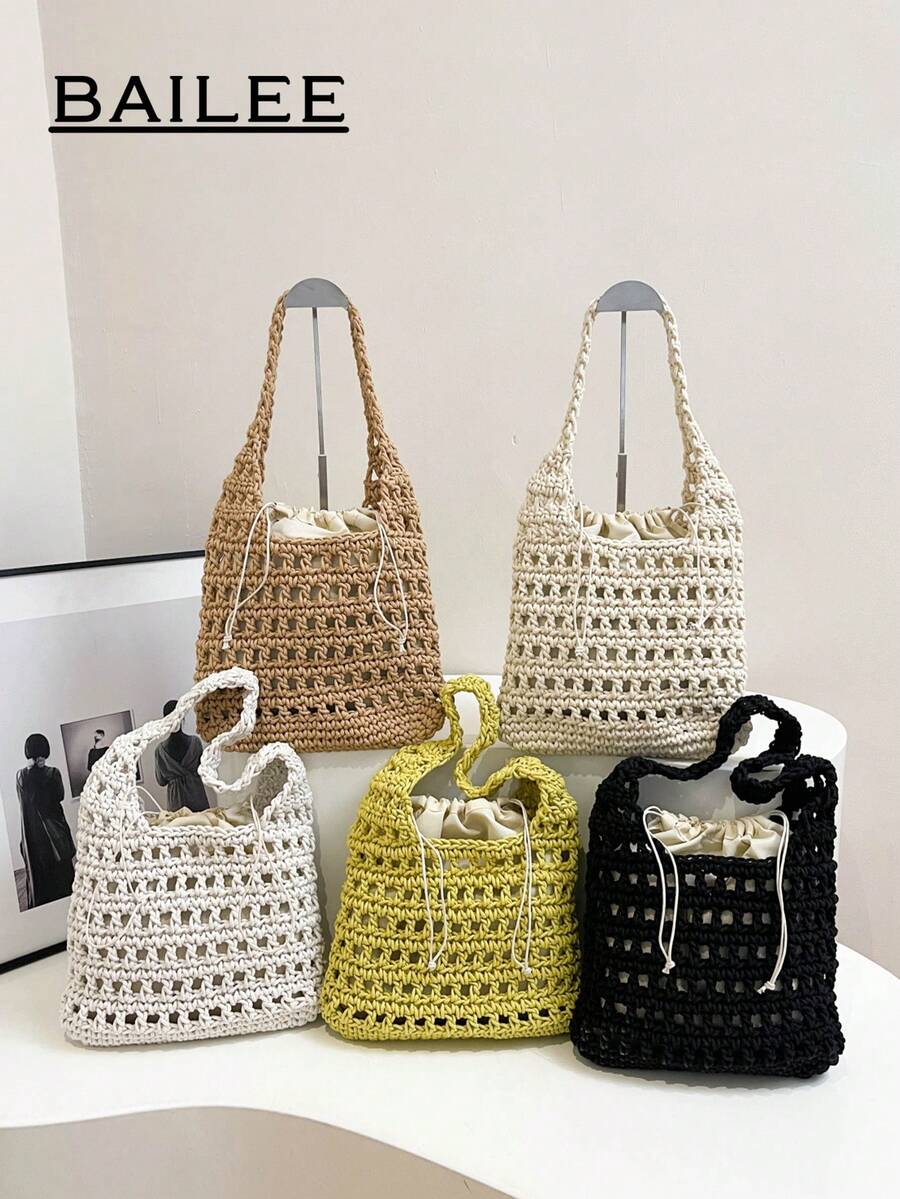 BAILEE 1 件全新米色镂空编织沙滩钱包,优雅轻便耐用单肩托特包,适合女士夏季海滩外出、度假和日常使用沙滩包