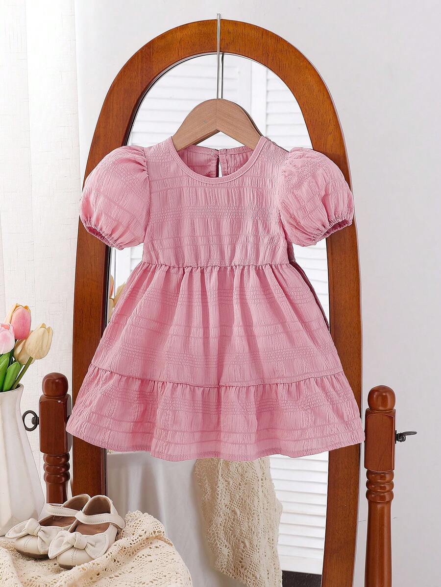 女婴可爱纯色圆领泡泡袖A字公主裙,舒适优雅,适合居家、日常穿着、外出、春夏季