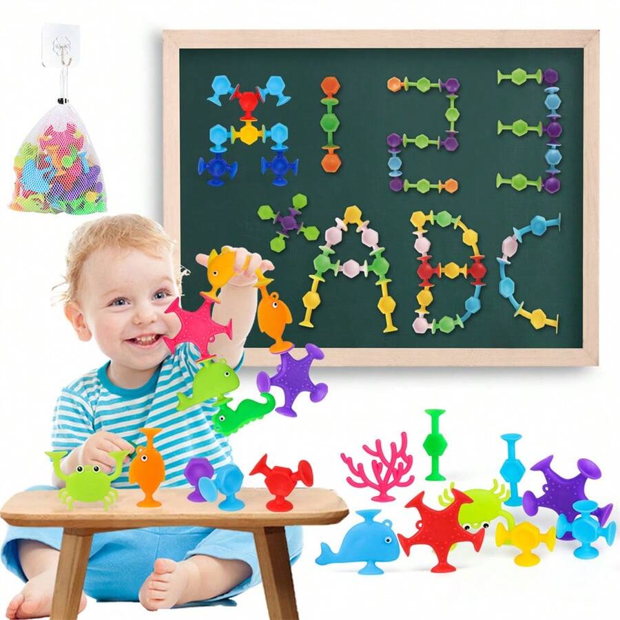 針對3-5歲幼童的嬰兒吸盤玩具,適用於4-8歲兒童的浴室玩具,40pcs海洋感官玩具附網袋收納,使用硅膠窗口浴缸旅行玩具,男女兒童禮物