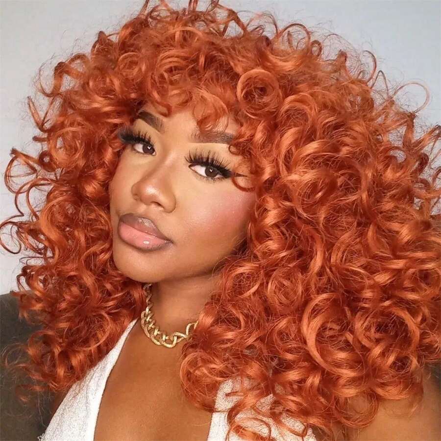 DZfirst 合成耐热假发 弹性卷发 带刘海假发 铜姜色 18 英寸化纤假发 刘海假发 日常使用 易于佩戴 适合初学者 弹性蓬松大卷发假发