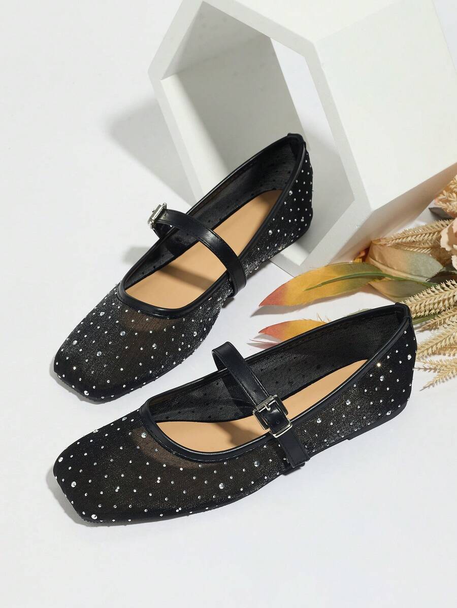 女士黑色网眼透气平底凉鞋,水钻装饰玛丽珍芭蕾平底鞋,轻便舒适,适合夏季穿着
