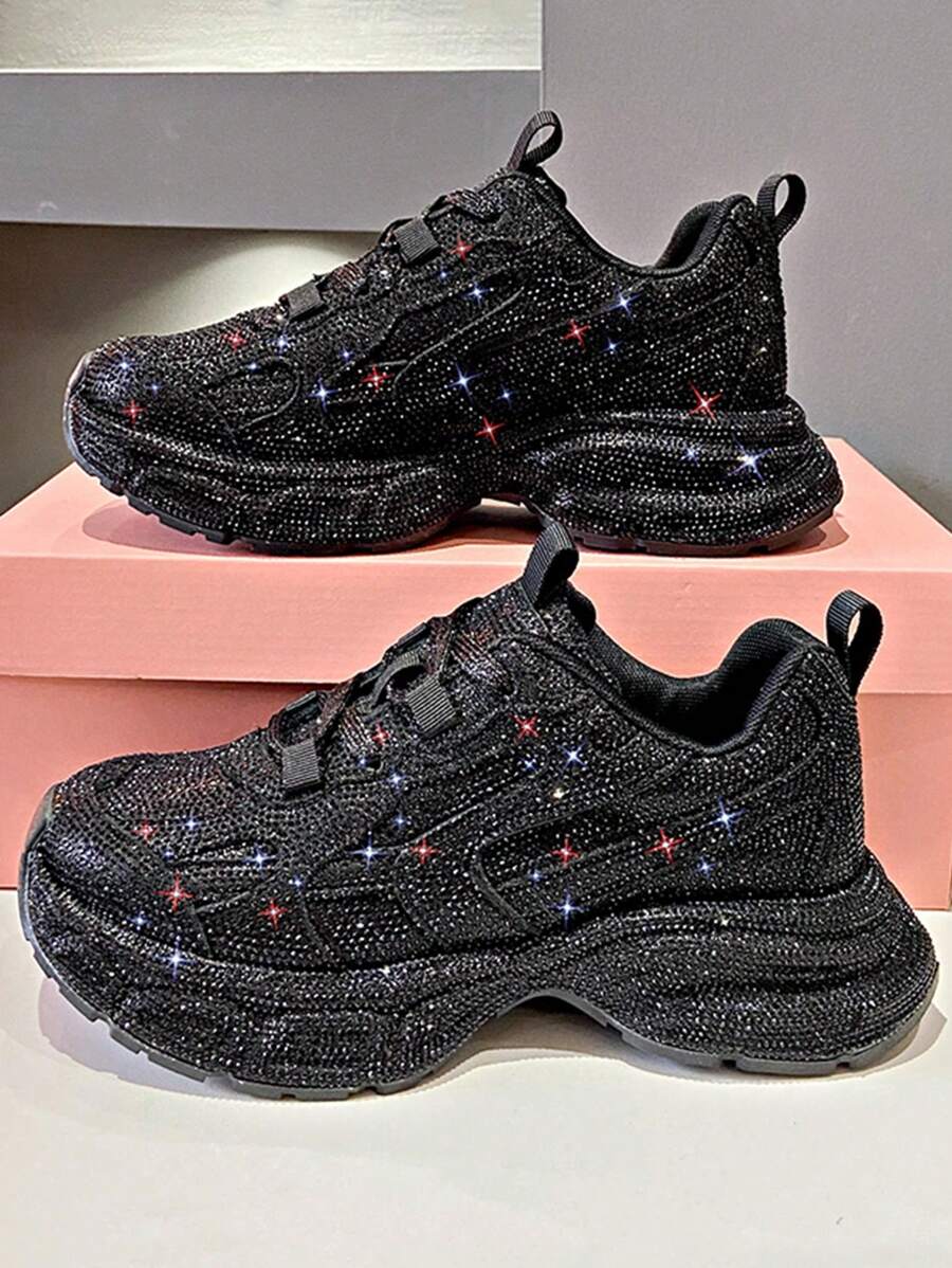女士黑色水钻厚底运动鞋,2025 年春秋季时尚 Ins 风格增高休闲运动鞋