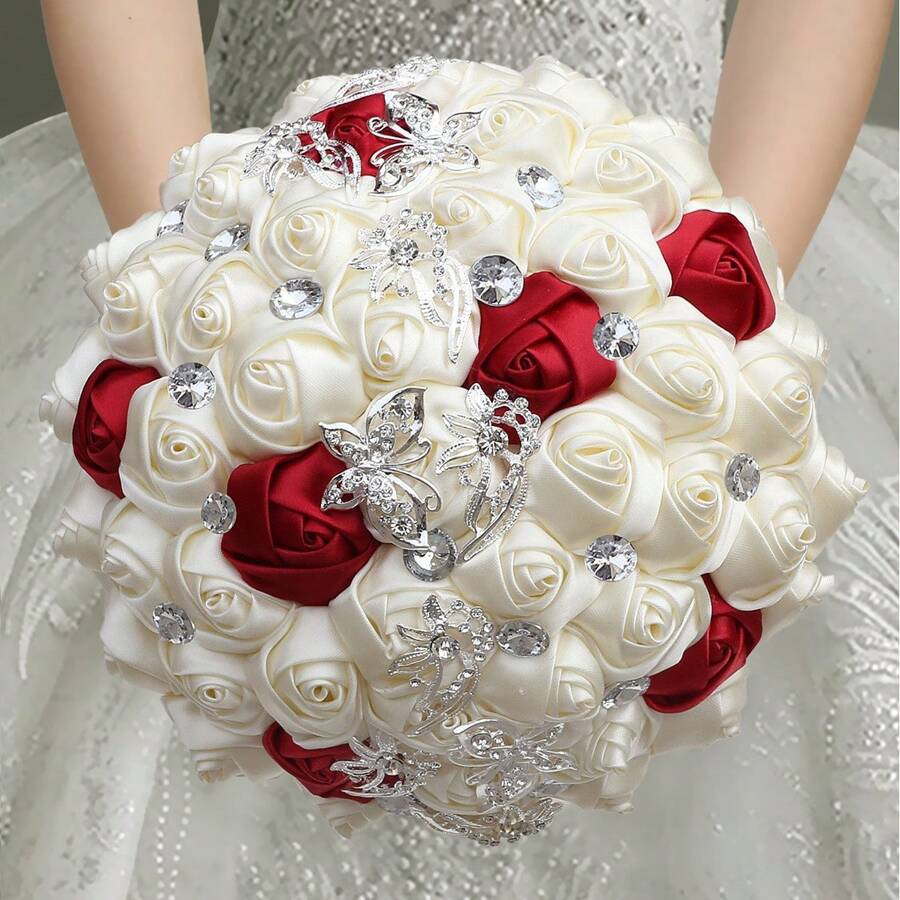 新娘婚礼奢华蝴蝶花束,闪亮银水晶缎带玫瑰,勃艮第奶油色面料永生花花束 W2216-Z