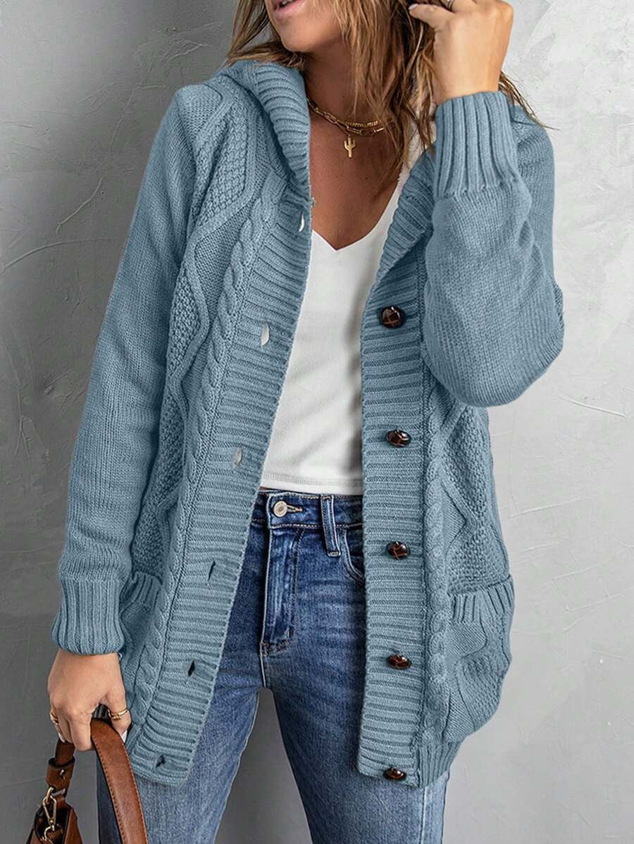 CILKOO 女士休闲麻花针织开衫,带口袋,宽松版型,纯色灰蓝色连帽开衫,纽扣闭合,长袖上衣,适合日常穿着