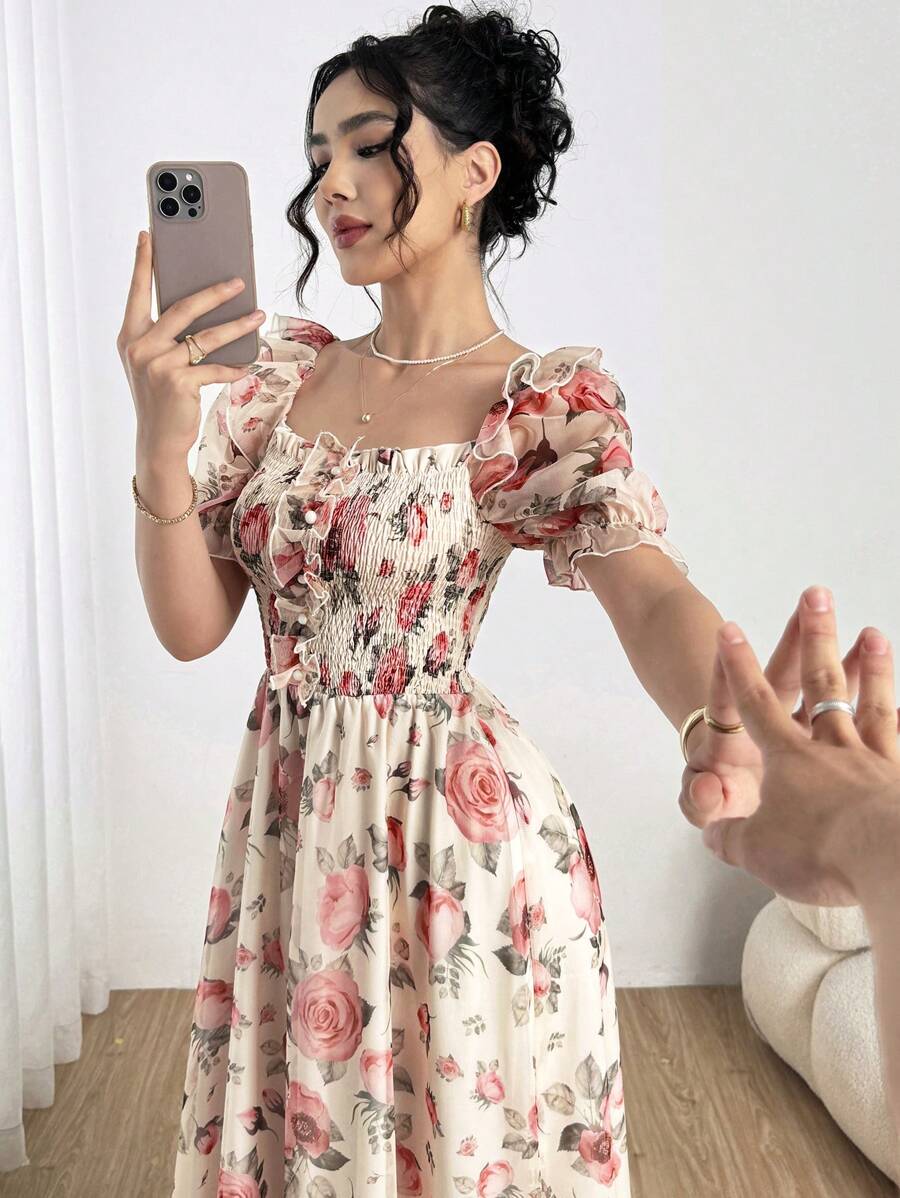 Modelyn 女式法式方领数码印花透视短袖连衣裙