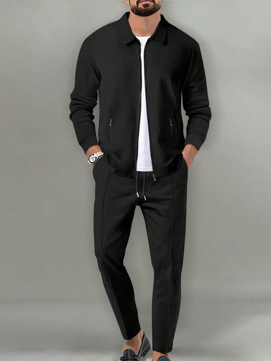 休闲春季服装,男士两件套,包括拉链口袋领夹克和宽松长裤,秋季服装