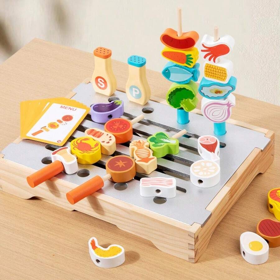 儿童多功能木制逼真厨房烧烤玩具,亲子互动过家家益智玩具/有趣的烧烤过家家游戏,培养孩子的动手能力,木制玩具/多张卡片可匹配或自由创作/非常适合新年、圣诞节家庭烧烤派对、丰收节烧烤、生日、节日礼物