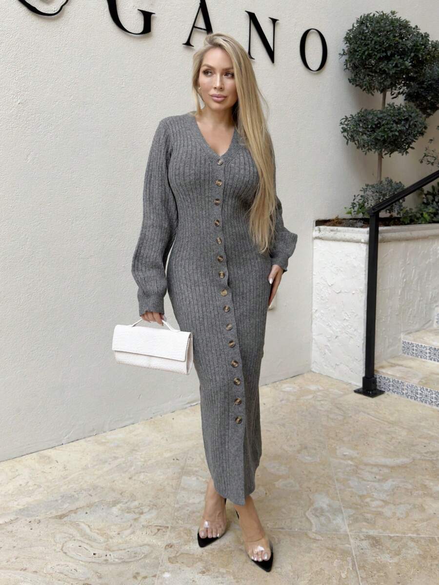 Cioccolato 女式休闲纽扣V领加长毛衣裙