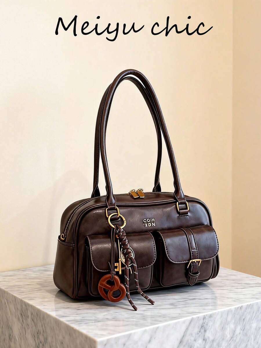 经典小丑纯色PU防水布包,字母图案装饰,多口袋贝壳包,可作单肩包或腋下包使用,配有吊坠,适合旅行、购物、通勤、聚会、约会和新年等场合。复古女士手提包,街头风日系时尚包。