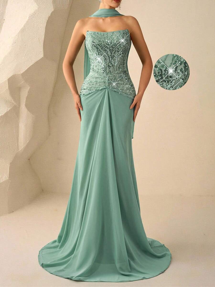 Coutiva 优雅抹胸上衣,串珠亮片缝边雪纺鱼尾裙摆派对礼服,适合生日派对、婚礼宾客、晚宴、毕业典礼等场合。