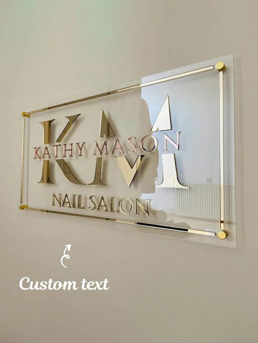 定制透明亚克力招牌,玫瑰金和金色字母及金色线条,定制矩形美容院装饰招牌,3D亚克力商业招牌 | 定制壁挂式招牌 | 矩形Logo招牌 | 适用于美发沙龙、美甲工作室、美容诊所、美容店、圣诞装饰、圣诞节、家居装饰