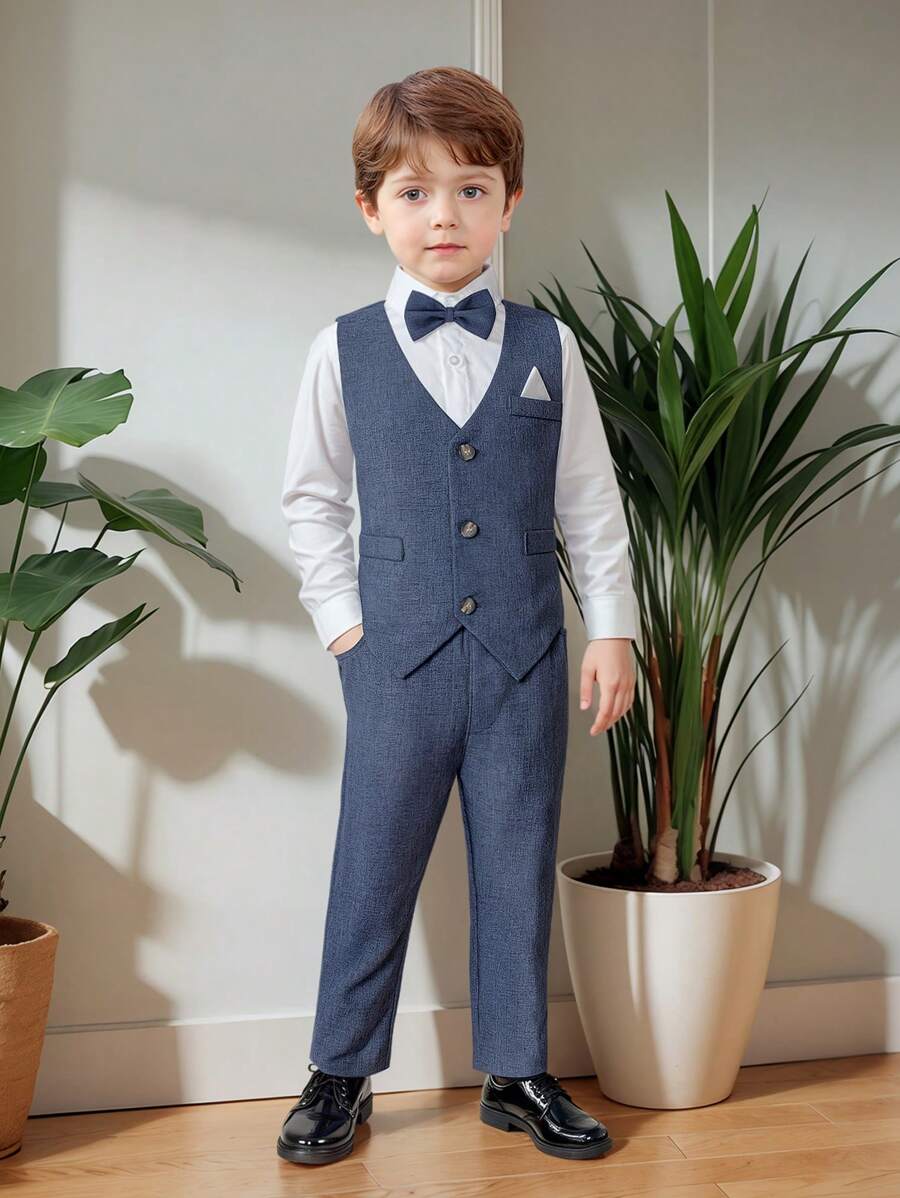 四件套男童修身正装套装,包括白衬衫、纯色马甲、领结和西裤,时尚优雅的男童绅士装束,适合婚礼、节日和选美比赛等场合。