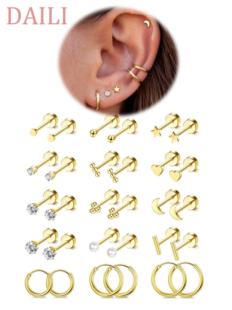 DAILI 5-21对18K镀金小号平底耳钉,男女通用,低过敏性医用不锈钢耳环套装,迷你螺丝耳骨耳钉