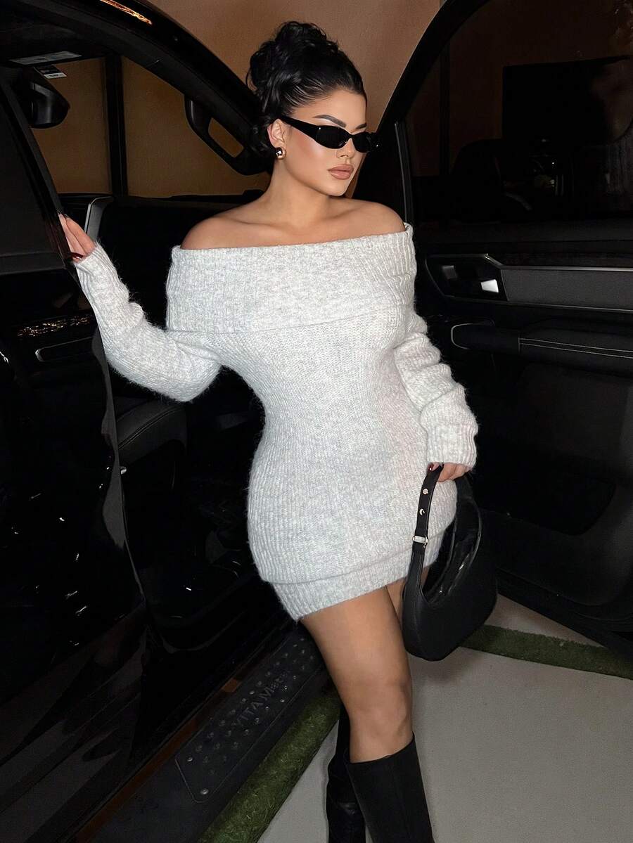 Dayanna Comas 灰色露肩高领长袖迷你毛衣裙,上衣宽松下装紧身,适合年轻女士,秋冬