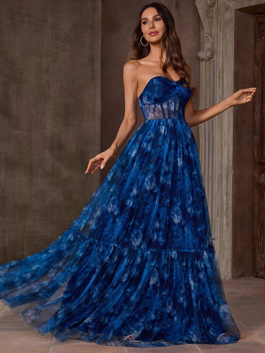 EVERLYL 花朵胸前褶皱全印花优雅派对网眼拉链网眼拼布抹胸连衣裙适合舞会约会派对生日派对周年纪念毕业派对正式晚宴婚礼宾客舞会返校派对舞台和音乐会夏季