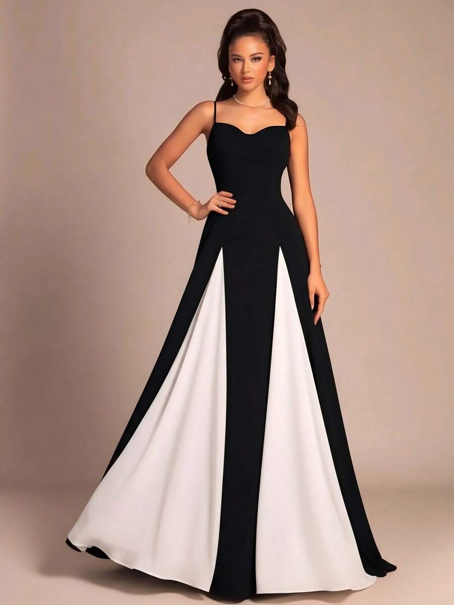EVERPRETTY 优雅雪纺心形领无袖黑白长款伴娘礼服,适合婚礼、派对、舞会、半正式场合。