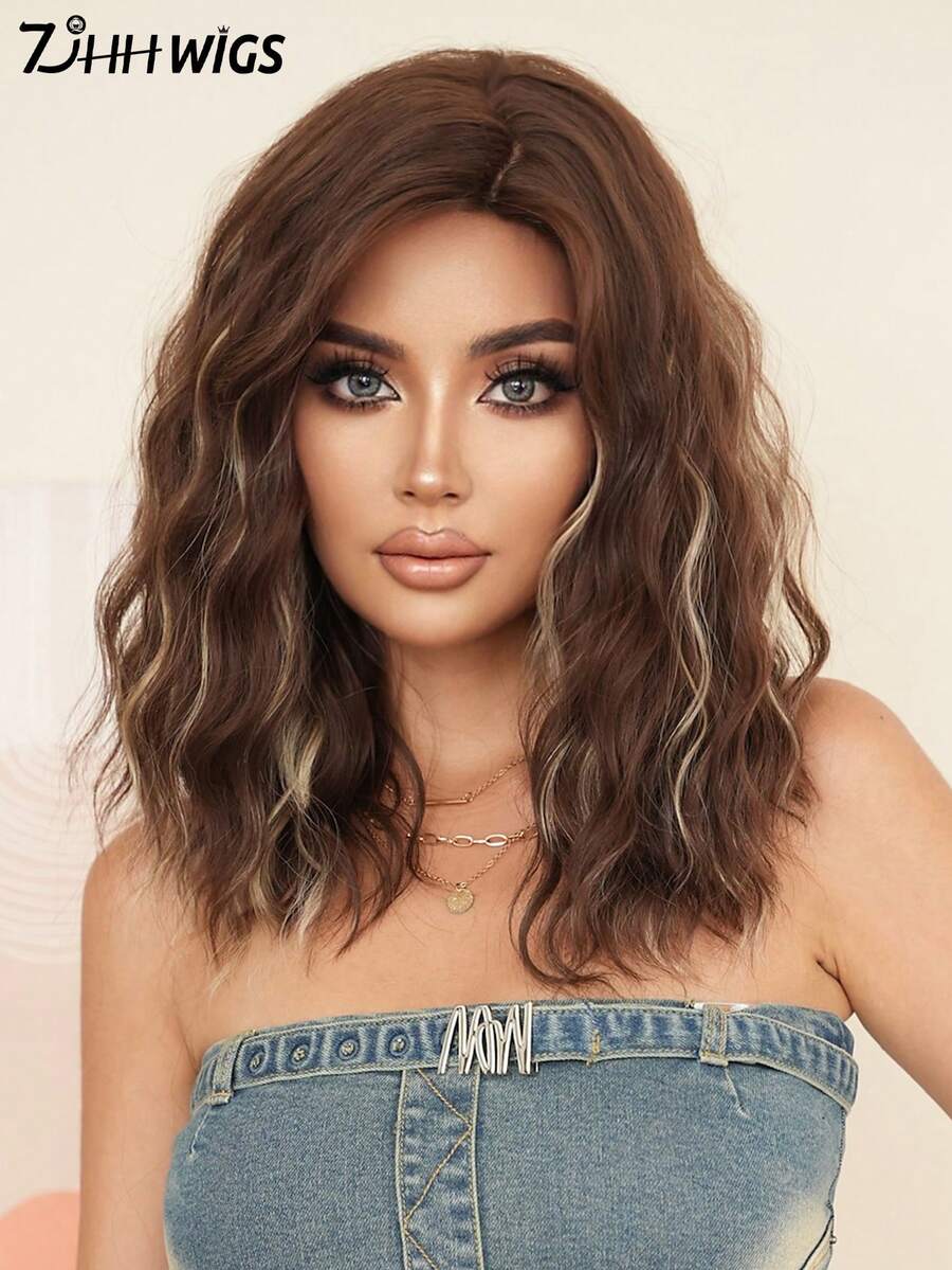 7JHH WIGS 18 英寸中长棕色金色挑染卷发假发,女士齐肩波浪假发,侧分刘海,天然合成耐热纤维假发,适合女孩日常派对使用