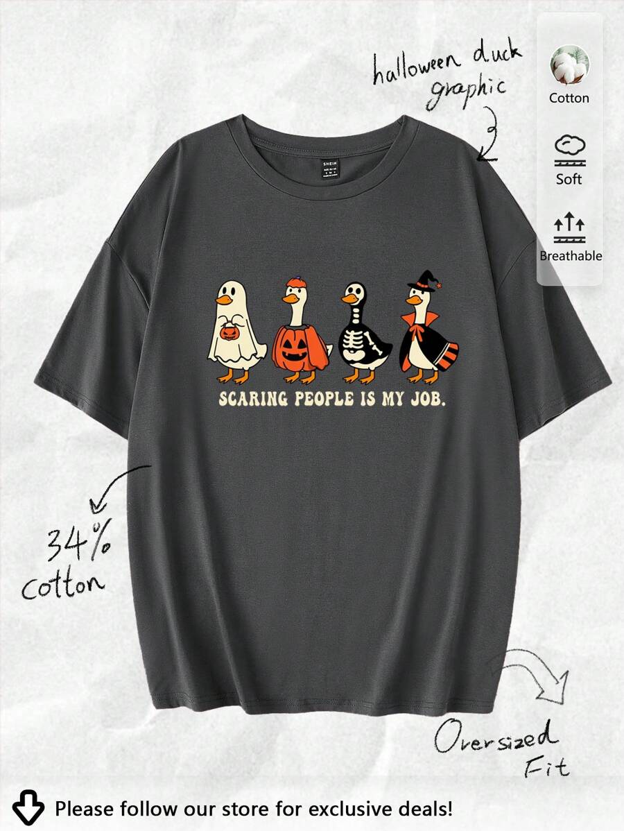 Tseoso 万圣节南瓜鸭图案超大宽松圆领短袖女式 T 恤,复古街头潮流,适合秋季、返校、派对