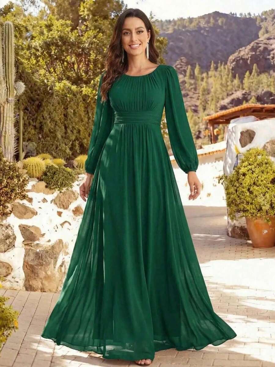 优雅雪纺圆领灯笼袖长袖深绿色伴娘礼服,适合特殊场合、盛会、婚礼宾客等。