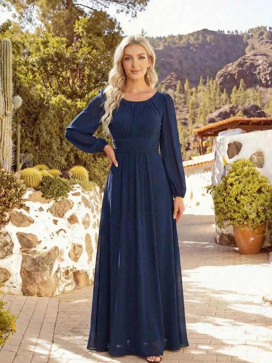 优雅雪纺圆领灯笼袖长袖藏蓝色伴娘礼服,适合特殊场合、盛会、婚礼宾客等。
