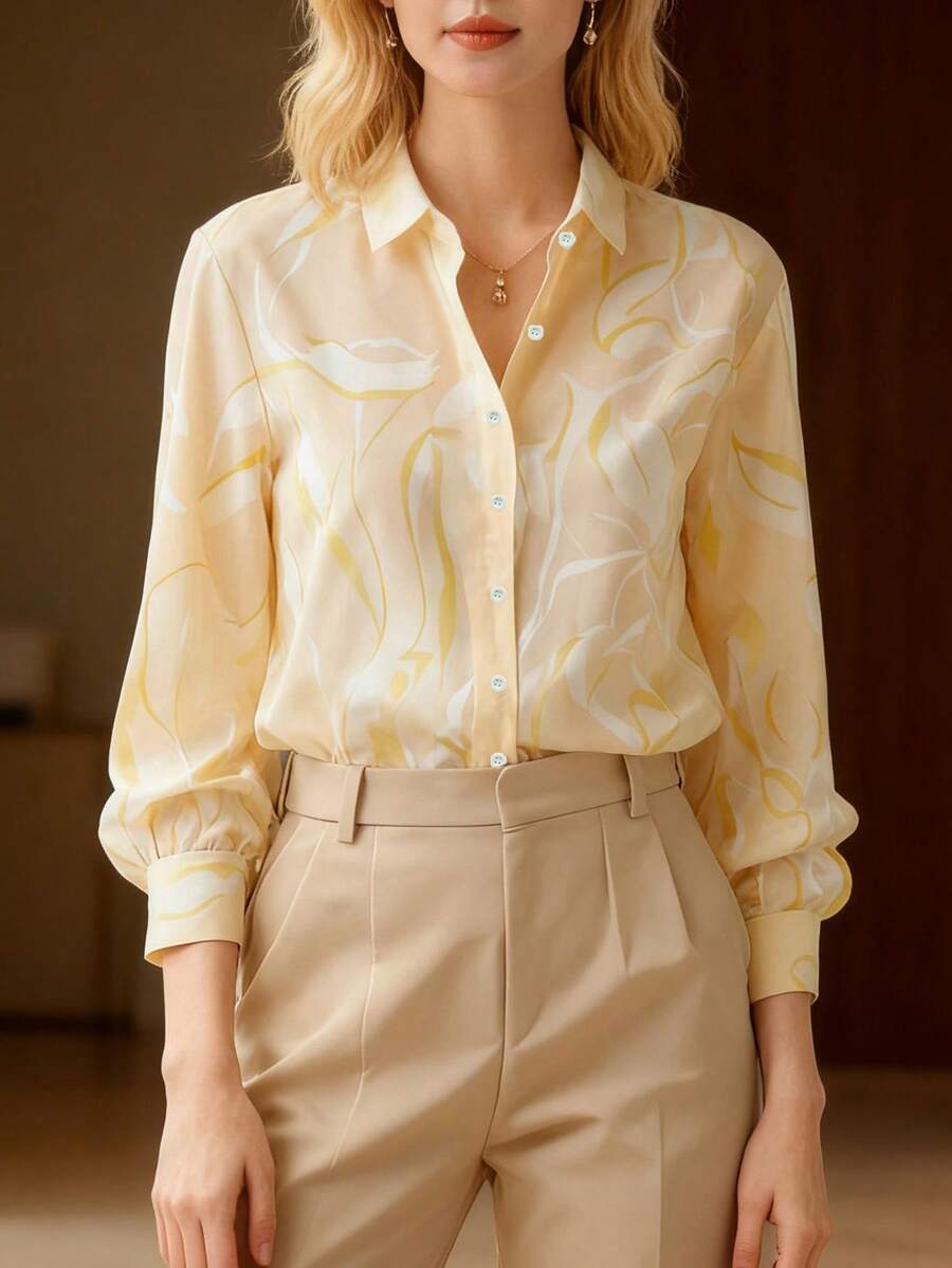 优雅女士长袖印花法式衬衫,纽扣开合,衬衫领设计,通勤上衣