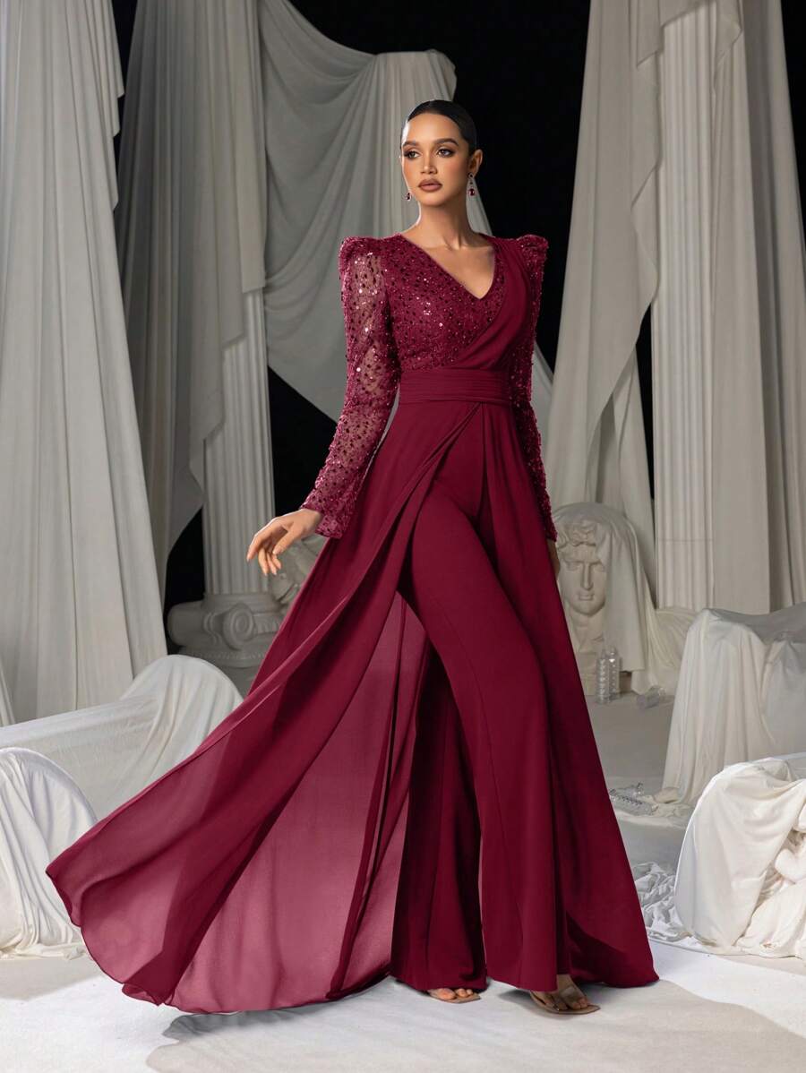 Faeriesty 惊艳长袖晚装连身裤,配雪纺覆层和闪亮亮片 - 优雅飘逸的轮廓,适合豪华宴会、红毯盛会、婚礼和正式晚会