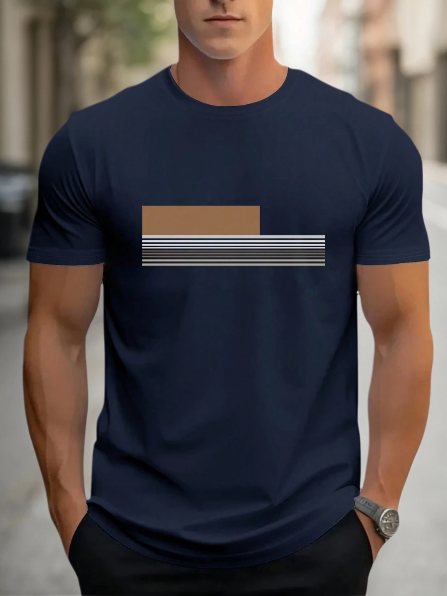 男士休闲条纹印花圆领短袖 T 恤,夏季