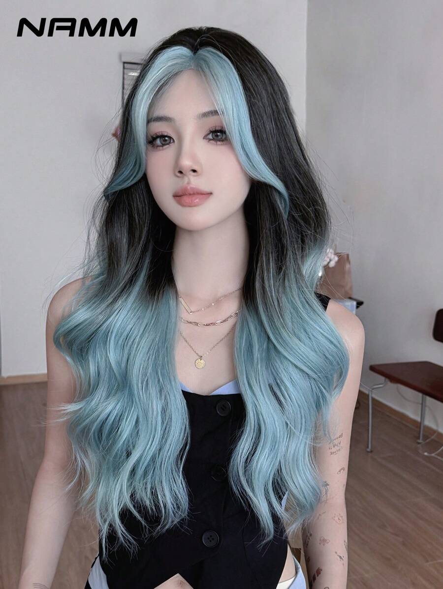 NAMM 28 英寸小号蕾丝前假发,渐变蓝色长波浪假发,适合女士中分发质,2*0.5 U 部分,合成耐热纤维假发,适合女孩日常派对、角色扮演、音乐节、街头装扮、樱花节、角色扮演动漫或服装使用