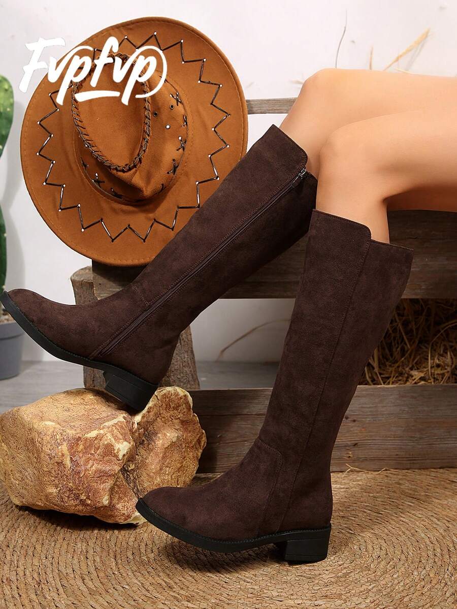 FVPFVP 2025 2024 秋冬新款百搭及膝靴女款粗跟弹力修身高筒马靴平底西部靴