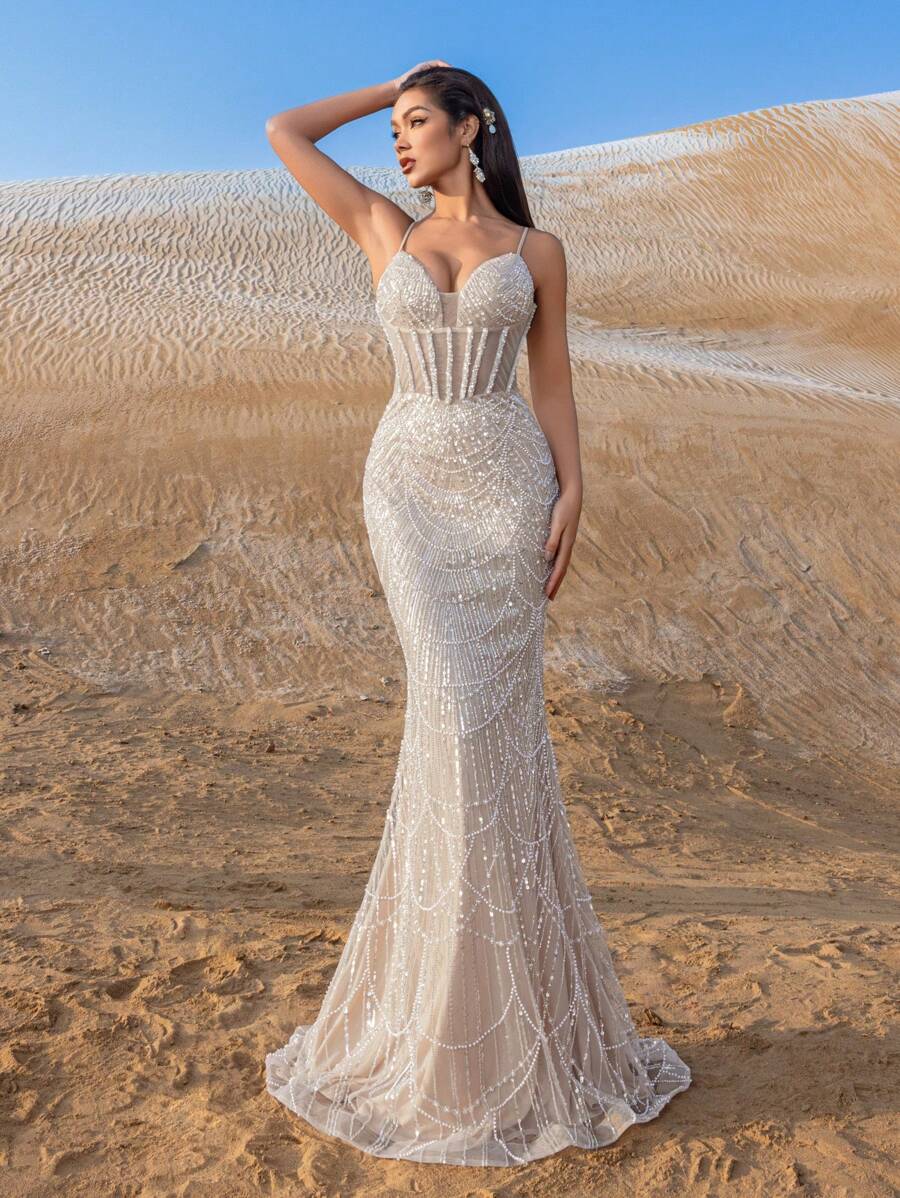 Faeriesty Haute Glamour 优雅细肩带串珠亮片鱼尾晚礼服,优雅正式礼服,适合春夏秋季 - 红毯、婚宴、庆典、正式晚会、名人派对