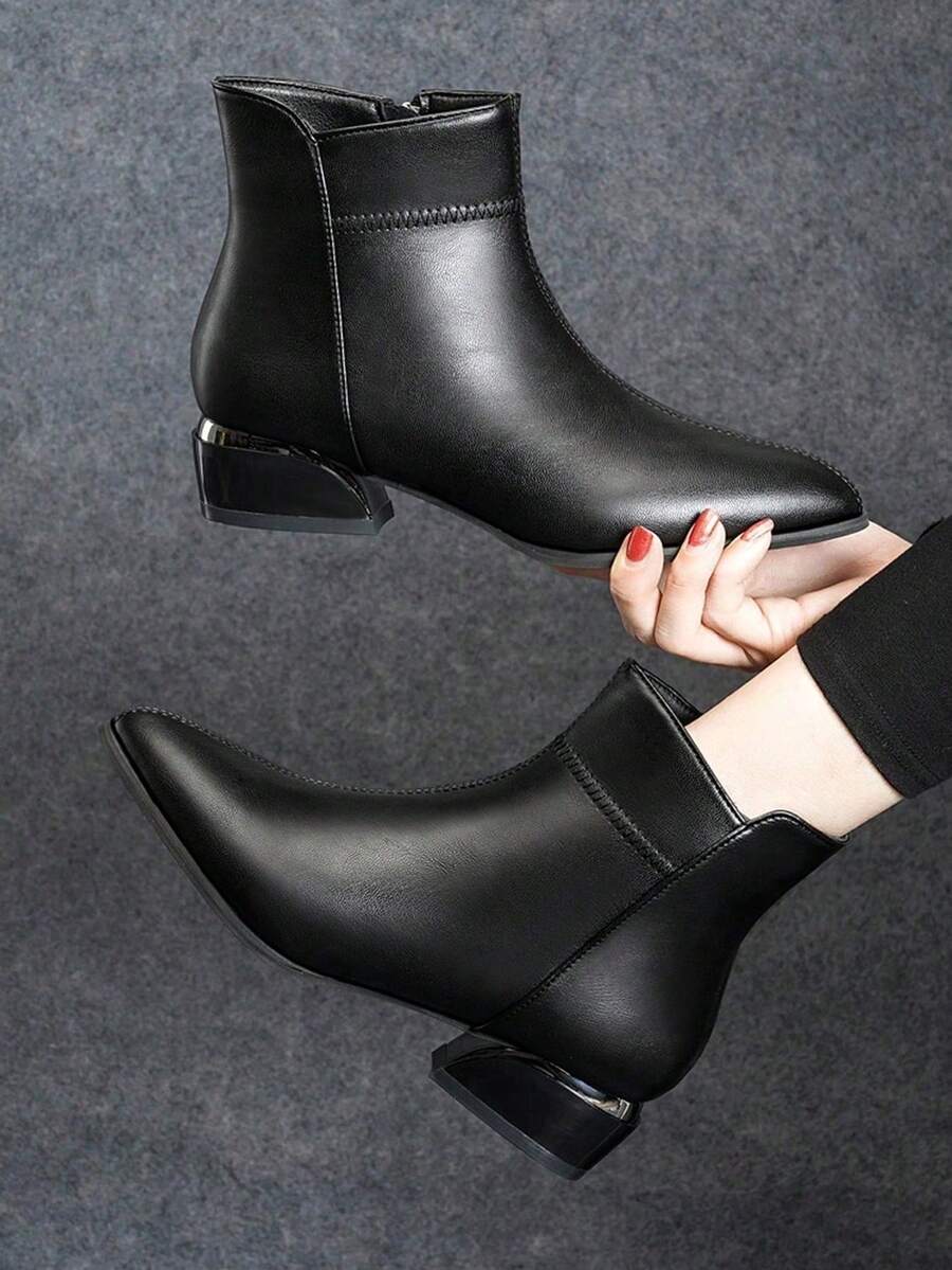 秋冬女士高端黑色皮革4厘米拼接折叠尖头电镀亮面粗跟金属侧拉链时尚性感派对短踝切尔西靴
