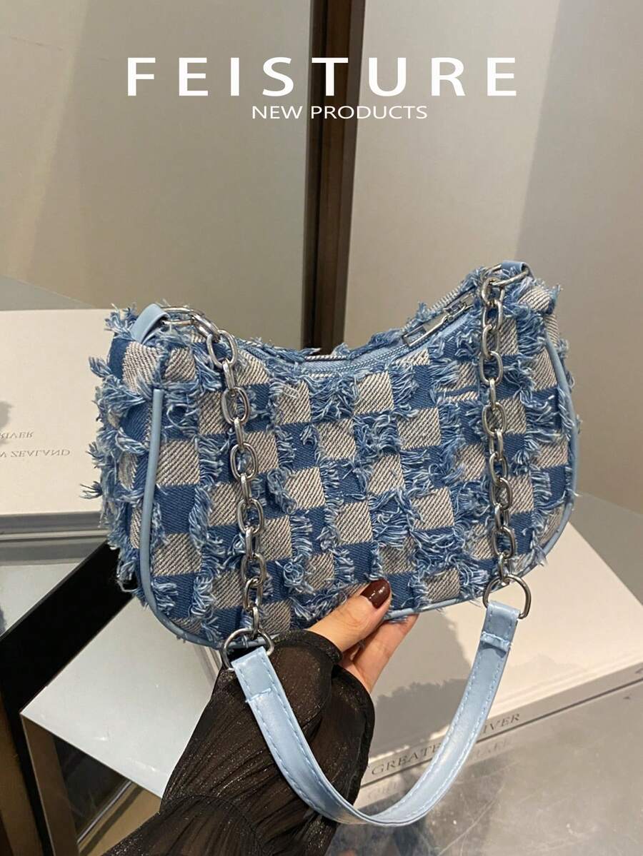 1 件蓝色牛仔拉链格纹印花拼布肩带时尚百搭单肩包,适合女性日常使用