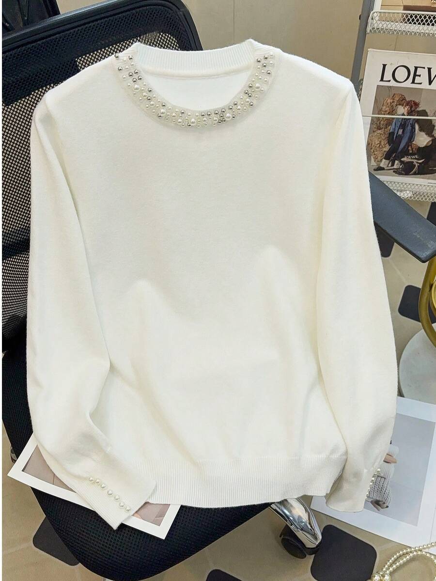 GIGOGOU 时尚串珠女式秋冬保暖毛衣休闲基本款长袖针织上衣秋季服装别致