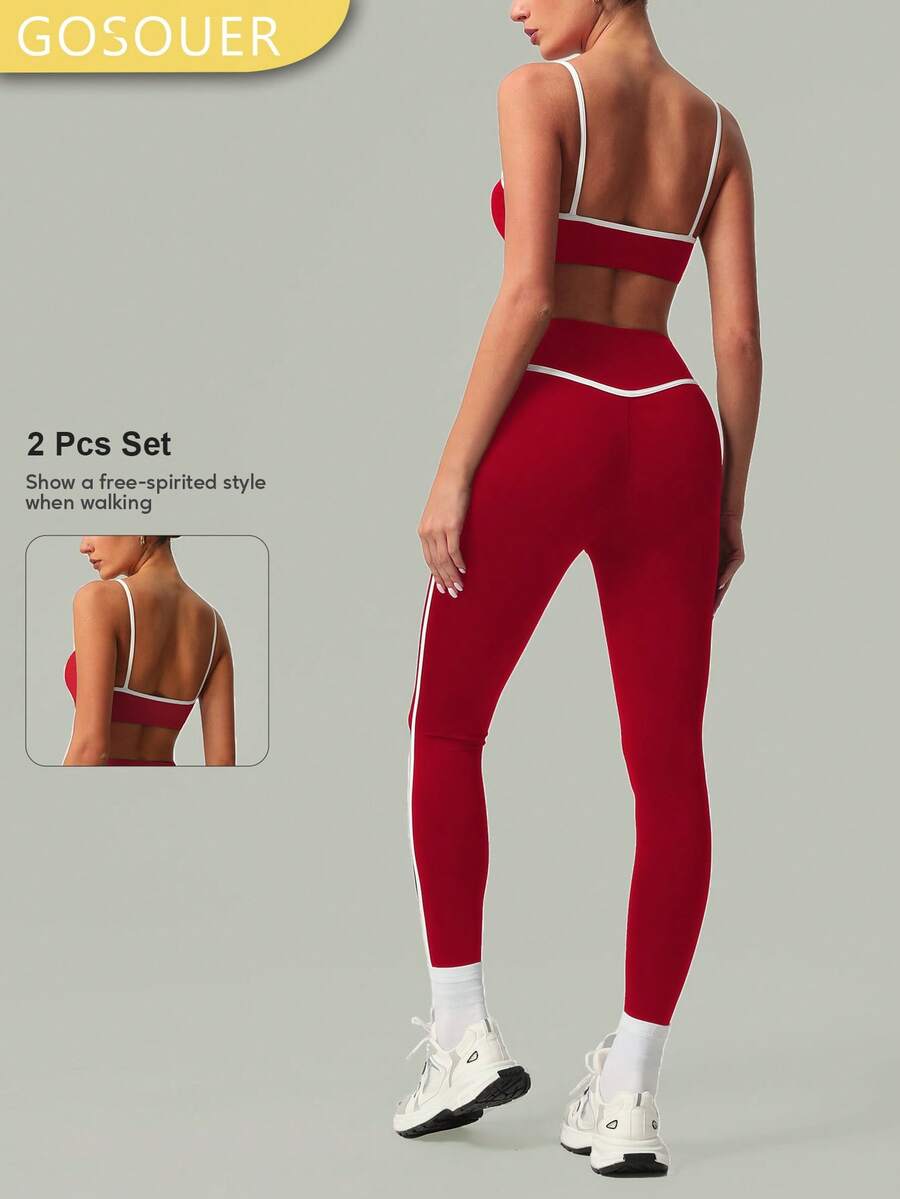 GOSOUER 2 件套 CO Ord 套装春夏女士时尚白色线条瑜伽运动文胸和紧身裤