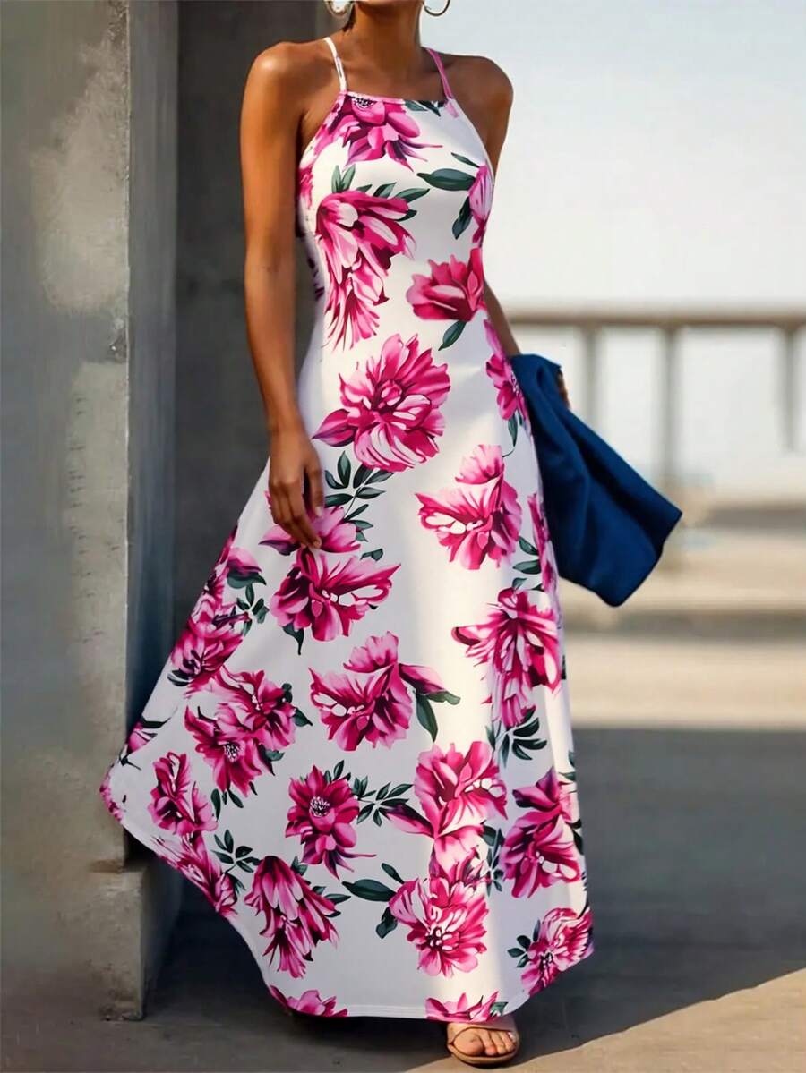 女式花卉印花长裙 - 优雅无袖 V 领下摆,轻盈涤纶,适合春夏季度假,粉色和白色玫瑰图案,海滩装,度假装花卉长裙飘逸修身连衣裙,海滩裙