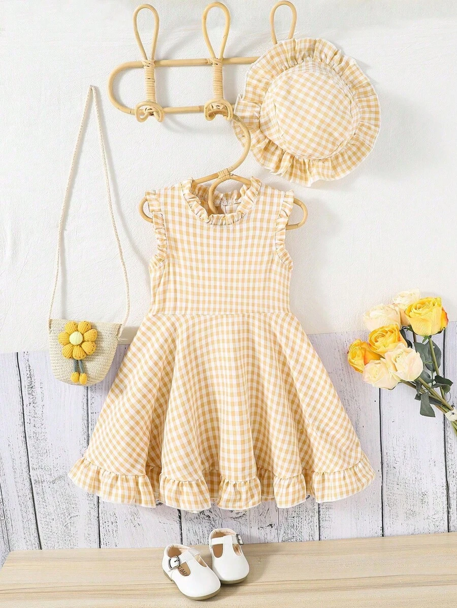 年轻女孩无袖荷叶边 A 字连衣裙,带帽子,甜美风格,轻盈服装,适合日常穿着,春夏季