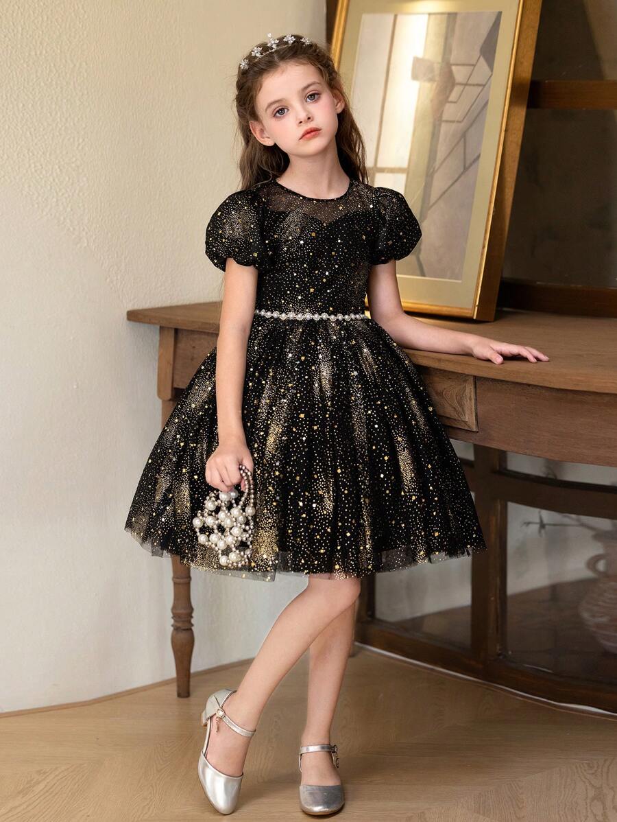 女童黑色短款薄纱星星印花派对连衣裙