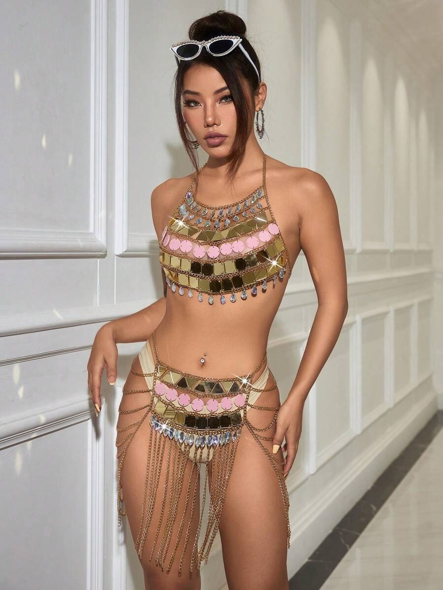 SHEIN Unity 女士鑽石裝飾丙烯酸鏈條連體無背心上衣和裙子套裝