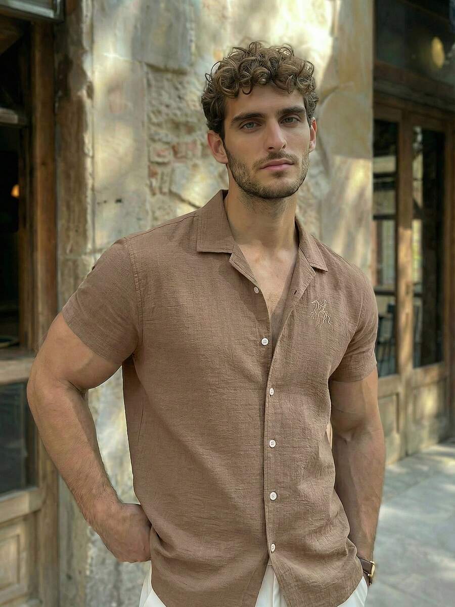 HIMLAND 男士夏季休闲纹理前开襟刺绣衬衫