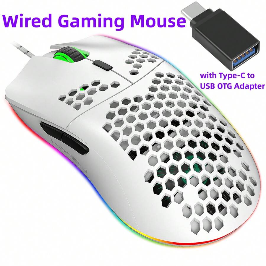 Hxsj有線電競滑鼠,帶rgb燈光,人體工學超輕蜂窩式滑鼠,支援所有遊戲的開關