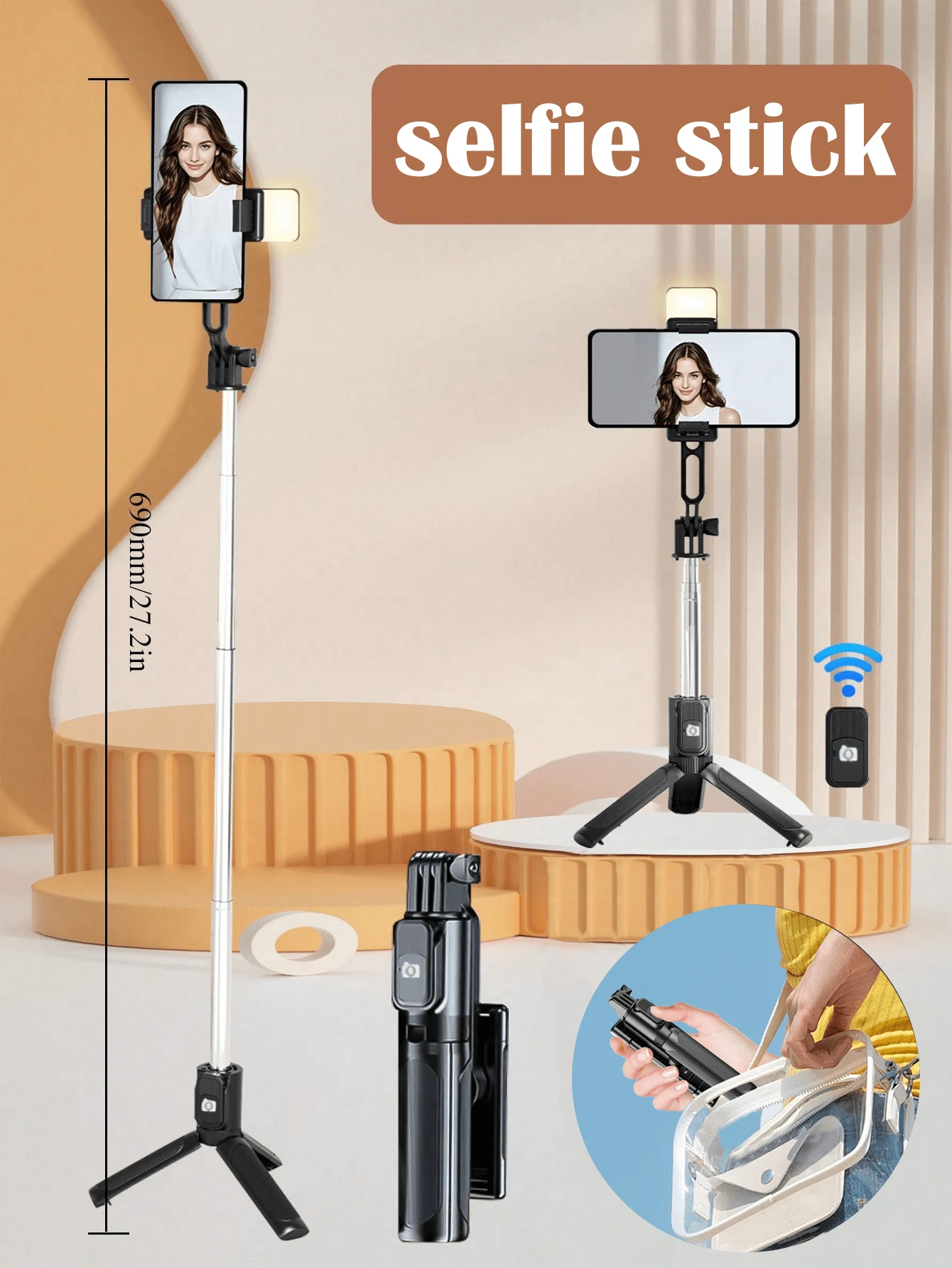 LED 三色便携式迷你蓝牙自拍杆,多角度可调三脚架,紧凑型 6.3 英寸可折叠,适用于直播、集体照和旅行,无线遥控器兼容大多数智能手机,兼容 Android 手机,适用于暑假、旅行、补光、户外活动、直播 Vlogging 设备