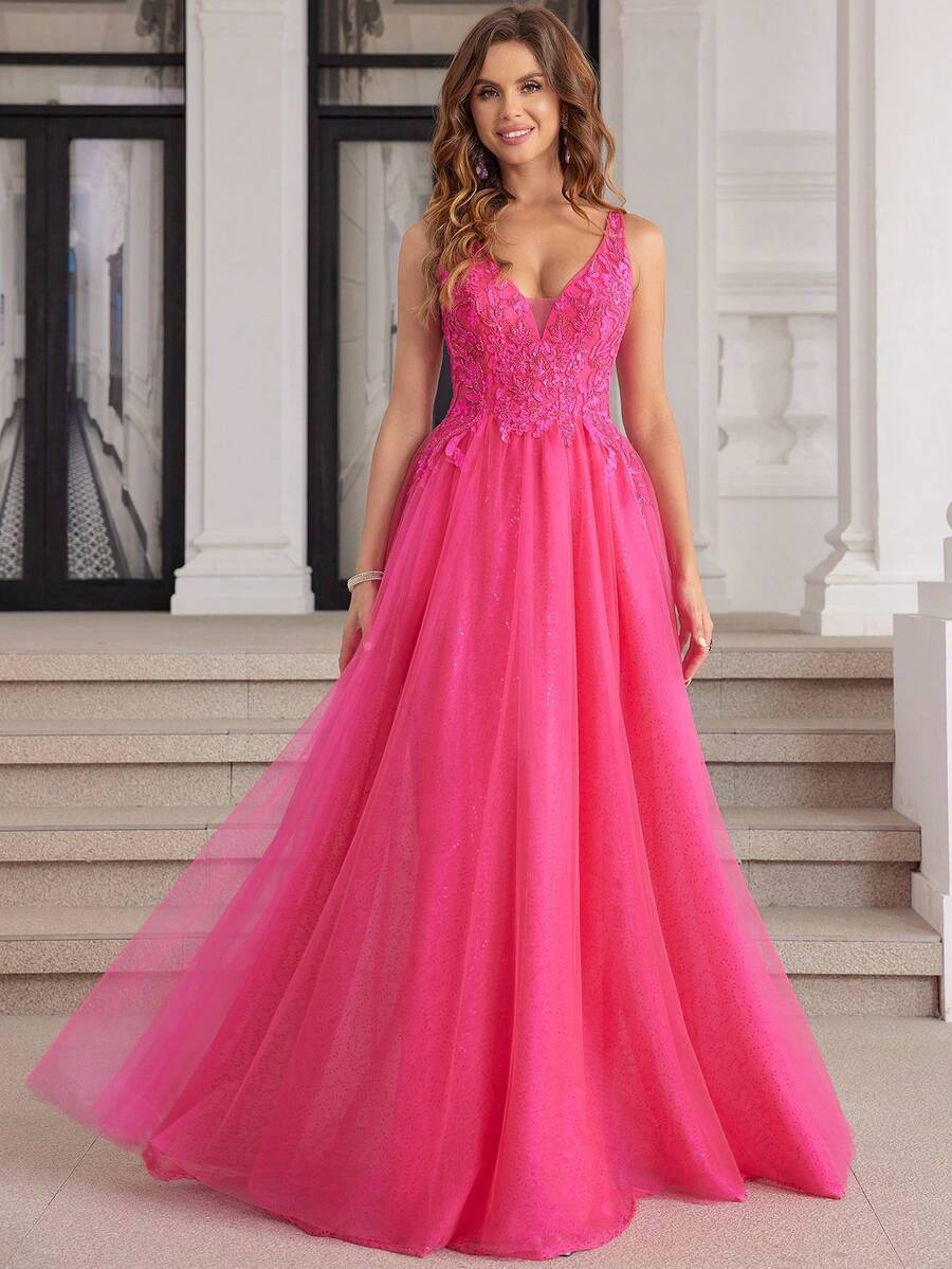 女士闪亮亮片刺绣网眼无袖派对礼服手工串珠蕾丝舞会礼服 A 字形系带后背亮片 V 领舞会礼服及地长背心返校节礼服青少年