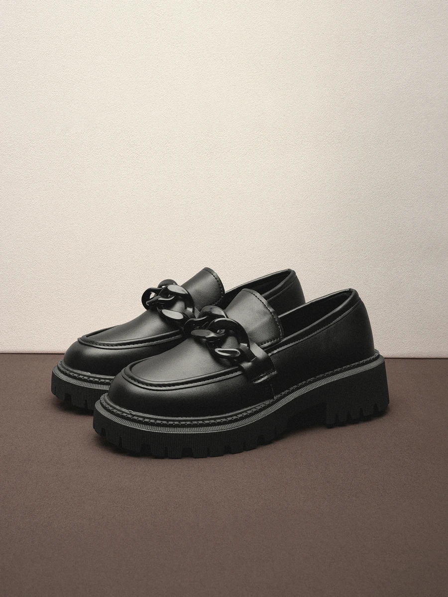 Hatastic 黑色厚底乐福鞋黑色金属扣复古平底一脚蹬休闲复古低帮运动鞋,通勤、护士、空乘人员均可穿着,学院风一脚蹬穆勒鞋