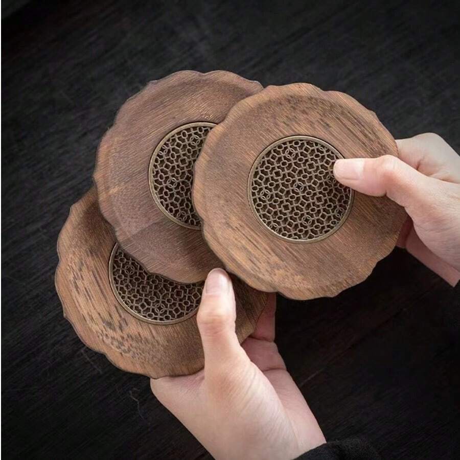 Lotus 竹木牛头杯垫,用于保护咖啡桌面 - 合金茶壶碟,用于火锅,日式防滑耐热杯垫,用于餐桌和厨房装饰,适用于各种杯子木制餐桌饮料