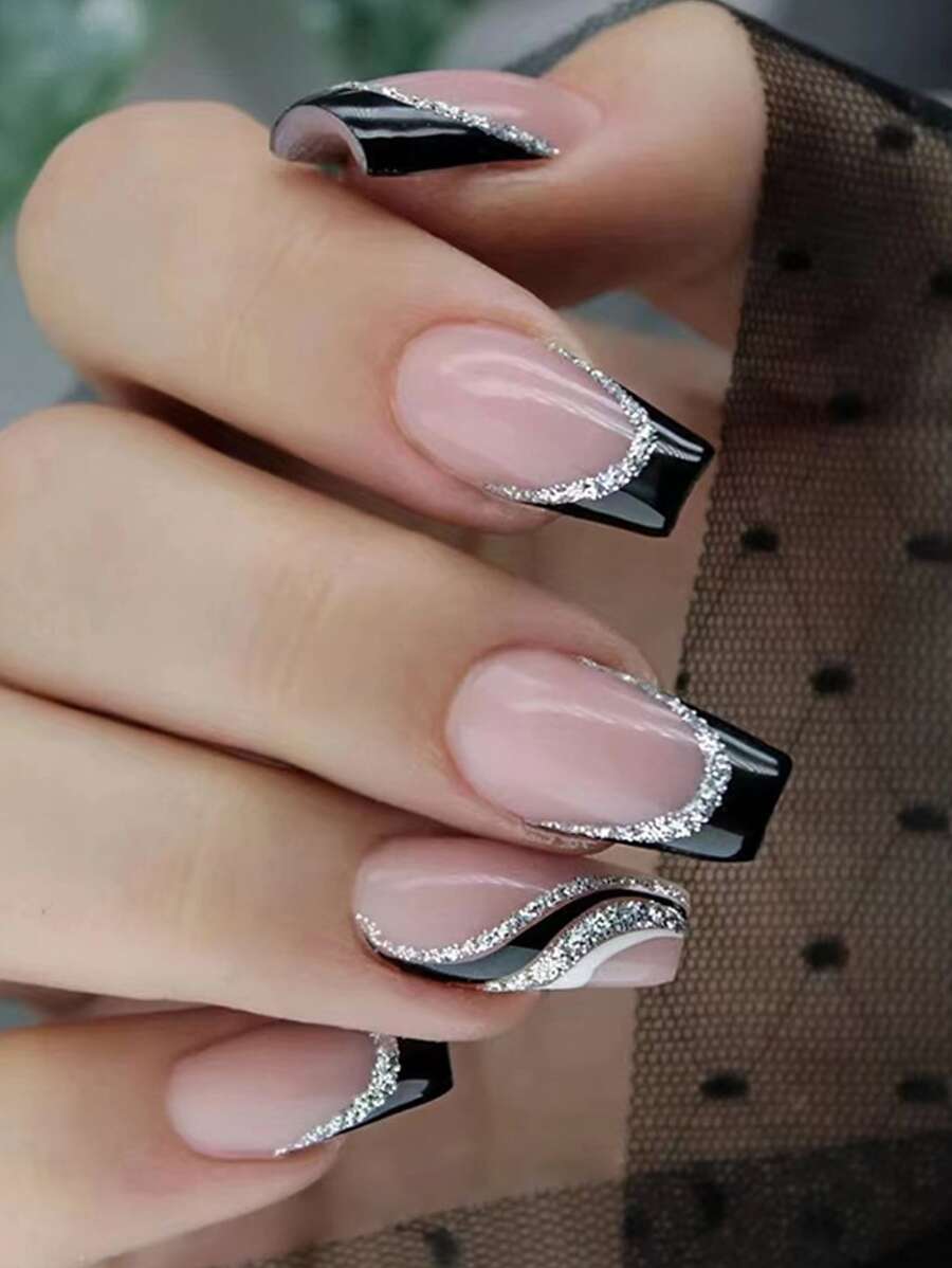瞬間提升魅力-24入組短棺材形黑色閃粉邊假指甲,果凍膠,1個指甲文件,1個貼假指甲工具套裝