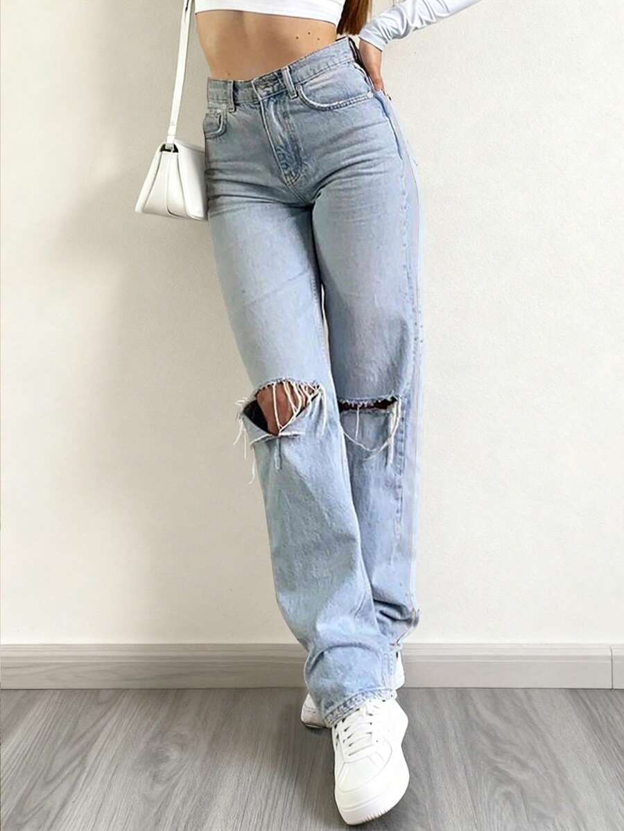NVFelix 女士做旧直筒牛仔裤,复古休闲户外风格,蓝色,适合冬季、感恩节和新年穿着