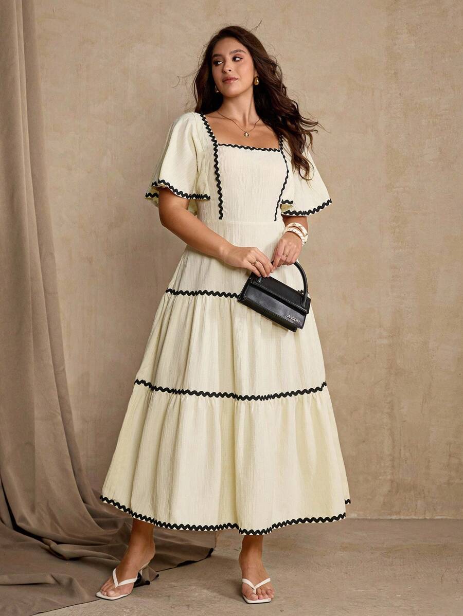 Roveilla 大码女式优雅拼色缎带饰腰中长连衣裙