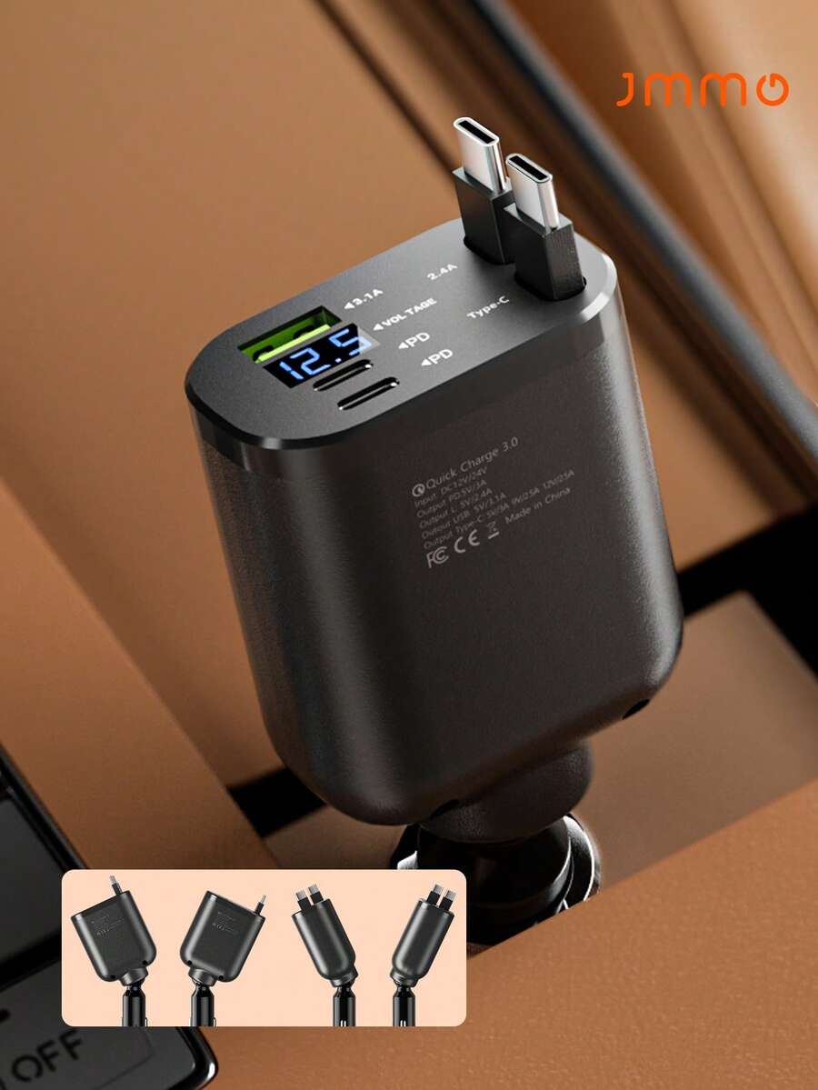 JMMO 66W 伸缩式车载充电器,带数字显示,5 合 1 快速车载电话充电器,带 2 个 PD 端口,2 根伸缩电缆和 USB 车载充电器,兼容 16/15/14/13/12,兼容 Galaxy,适用于 Pixel 等。