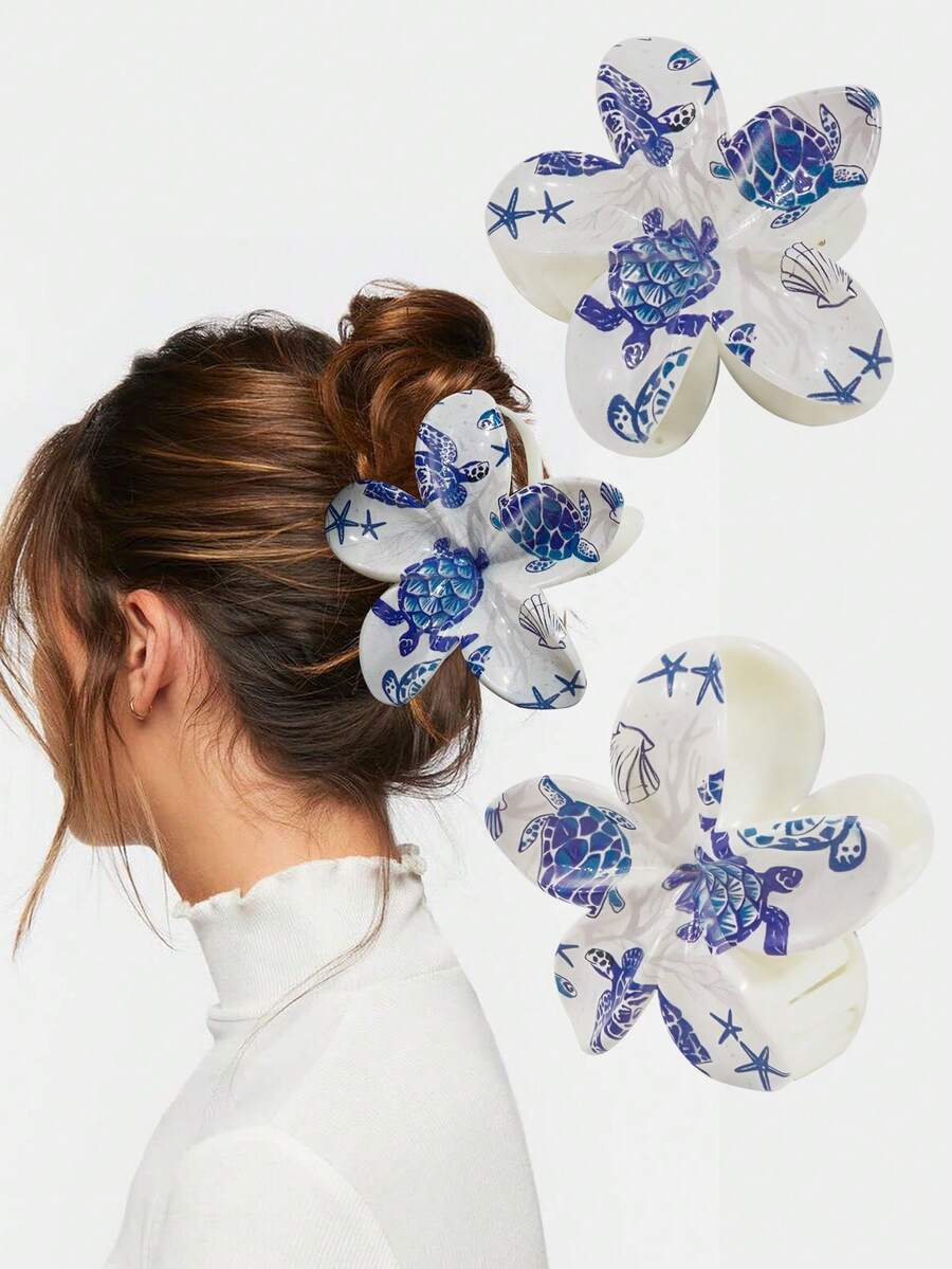 1 件女士时尚夏季树脂花朵发夹,优雅个性化蓝海龟/海星图案发夹,夏季海滩/水族馆纪念品礼物发饰时尚发饰秋冬度假装女士